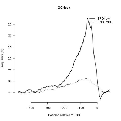 GC-box: as for CCAAT-box, EPDnew shows an enrichment in this element compared to the ENSEMBL collection.