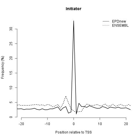 Initiator: it is found at the TSS and shows a great enrichment in EPDnew compared to ENSEMBL promoter collection.