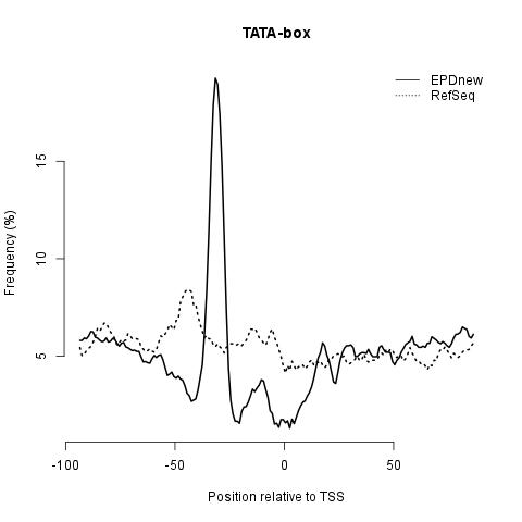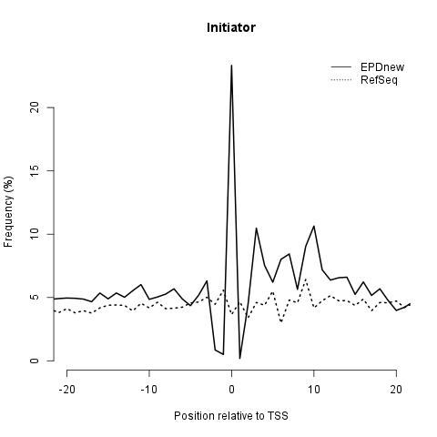 Initiator: it is found at the TSS and shows a great enrichment in EPDnew compared to RefSeq promoter collection.
